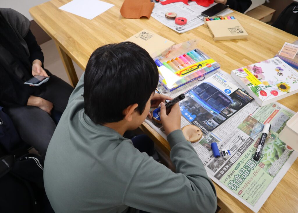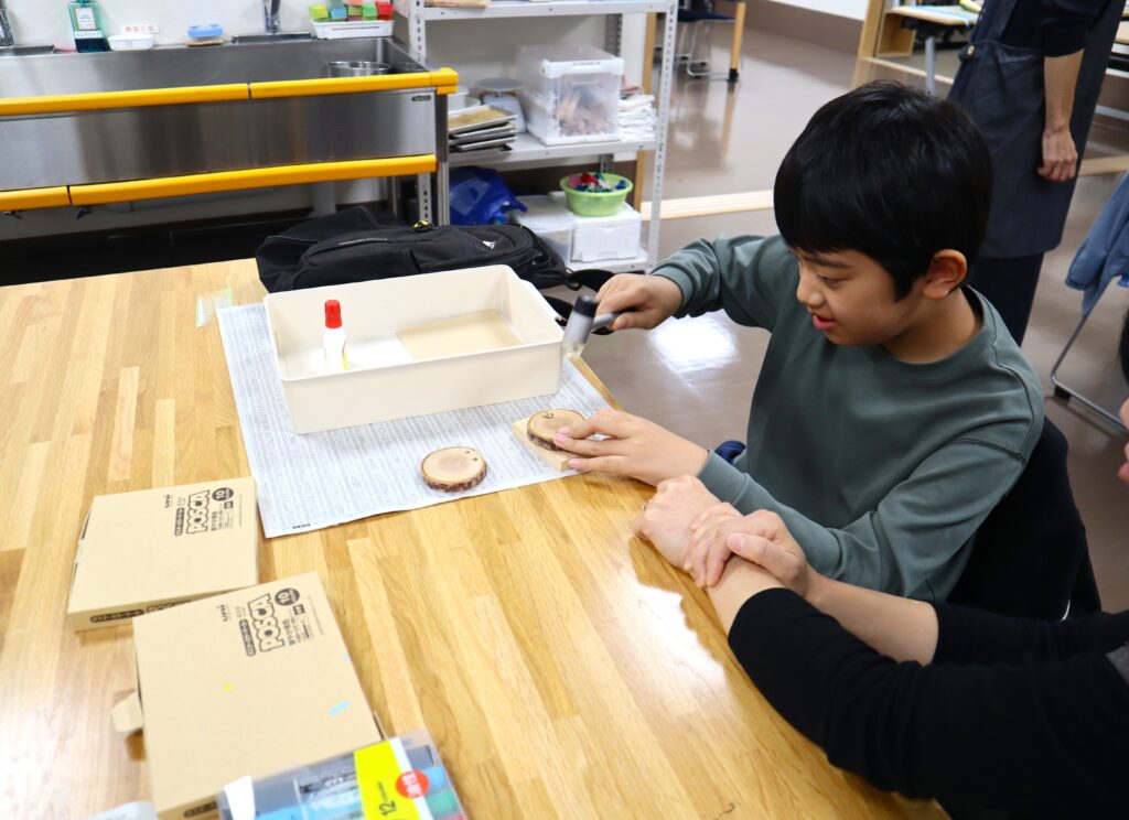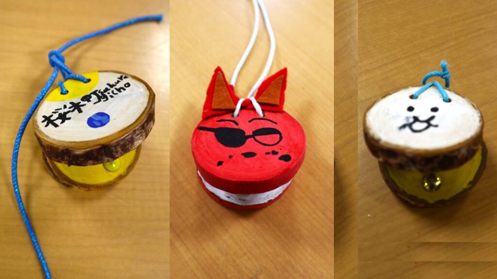 講師が用意した桜の木の木片に、音がよく鳴るように太鼓びょうを金づちで打ち付けます。