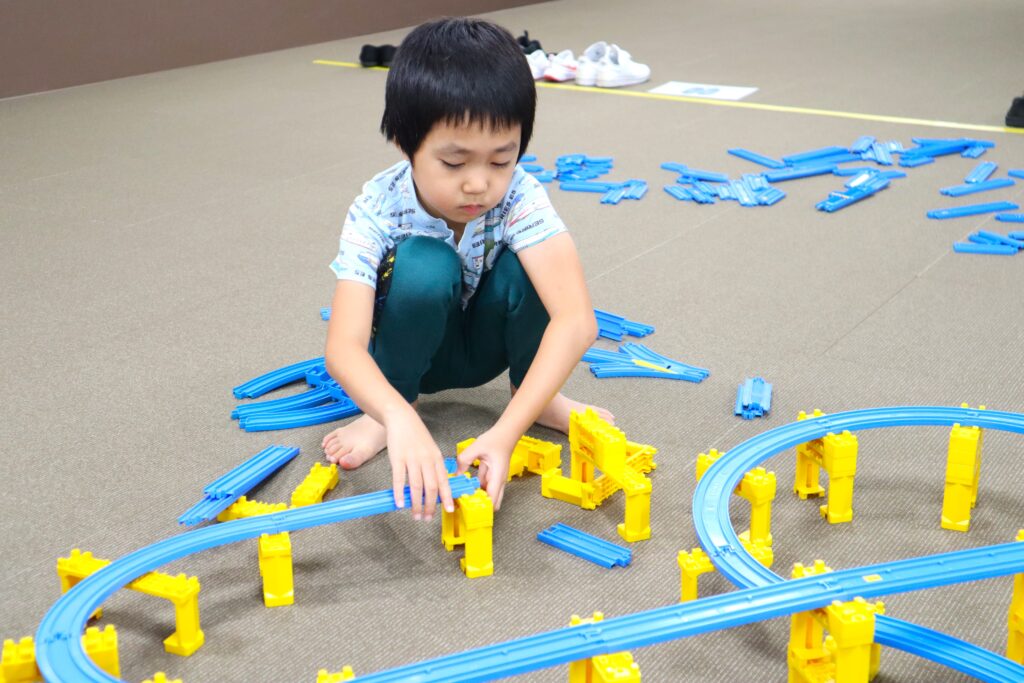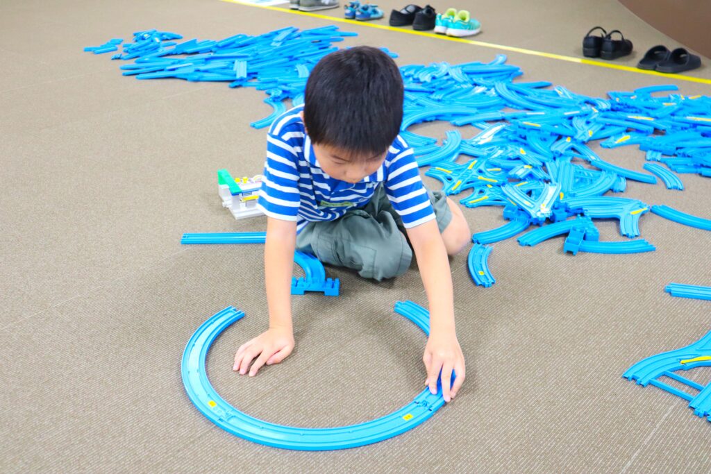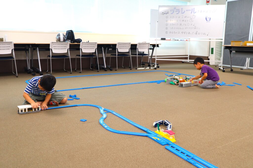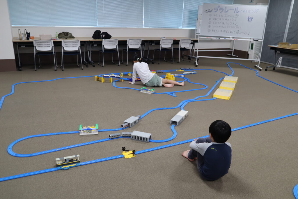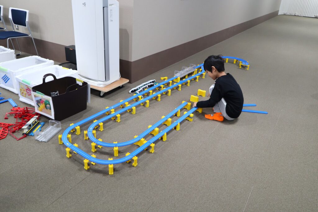 ラポール上大岡8階・多目的室の広い空間を使って、自由にプラレールを組み立てて2時間思いっきり遊ぶことが出来る「プラレールであそぼう!」