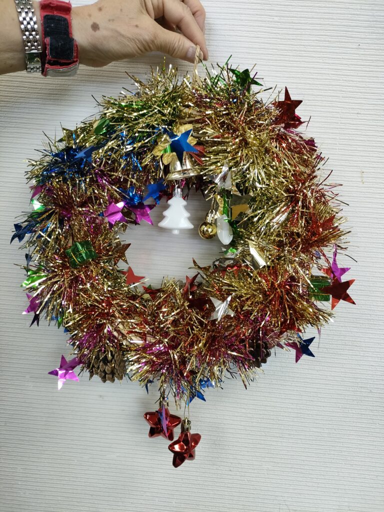 リースを選び、様々な色のモールやオーナメント、自然の木の実をグルーガンで貼り付けたり、ラッピングタイで結んでリースを華やかに飾りつけます。