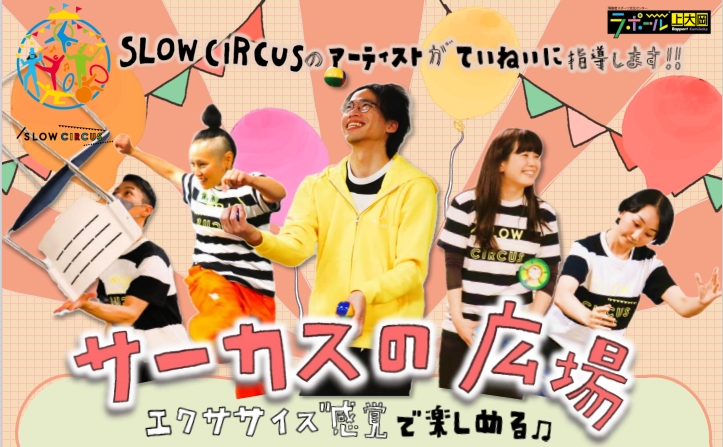 SLOW CIRCUSのアーティストとソーシャルサーカスで使われるジャグリングなどのサーカス道具の使い方や、からだをつかった表現を体験します。みんなで一緒に楽しくサーカスの技を練習しましょう!毎回、前半は1つの道具やテーマに絞って練習し、後半はいろんな道具を自由に練習できる時間を設けます。